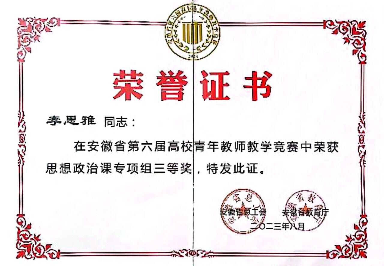 李思雅,2020年硕士毕业,于2022年7月任职于马克思主义学院。获得安徽省第六届高校青年教师教学竞赛思想政治专项组三等奖、学校第二届青年教师教学竞赛一等奖等奖项。