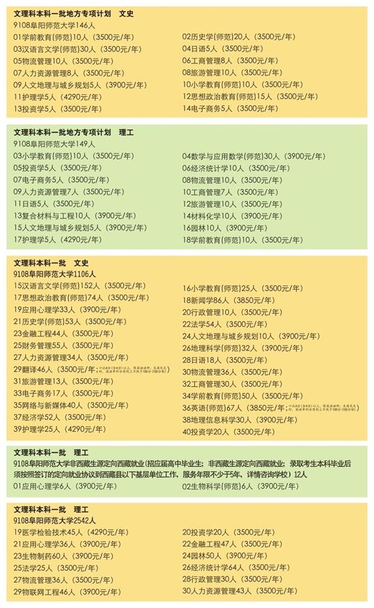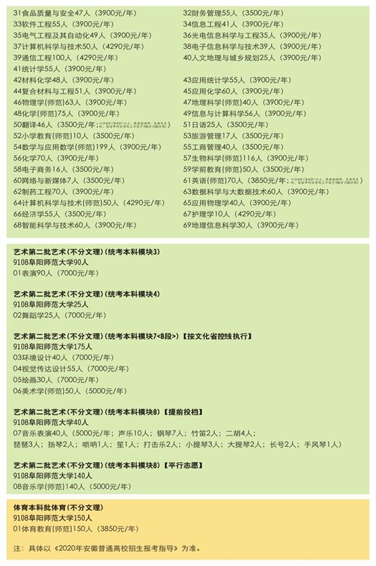 阜阳师范大学2020年招生简章(2):2020年安徽省招生计划