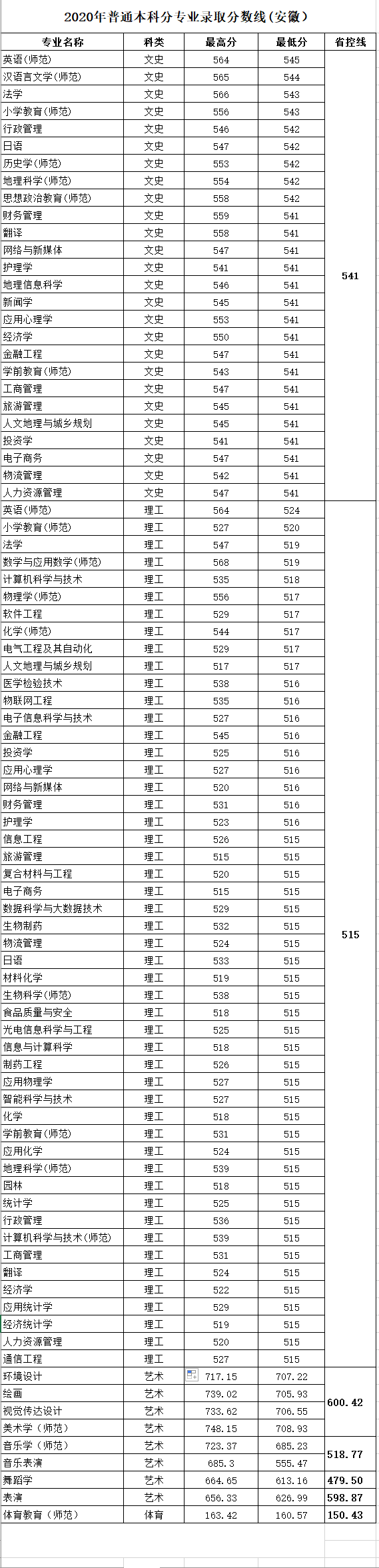 阜阳师范大学2020年普通本科分专业录取分数线(安徽)
