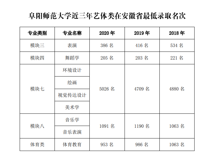 阜阳师范大学2018-2020年艺体类专业在安徽省最低录取名次