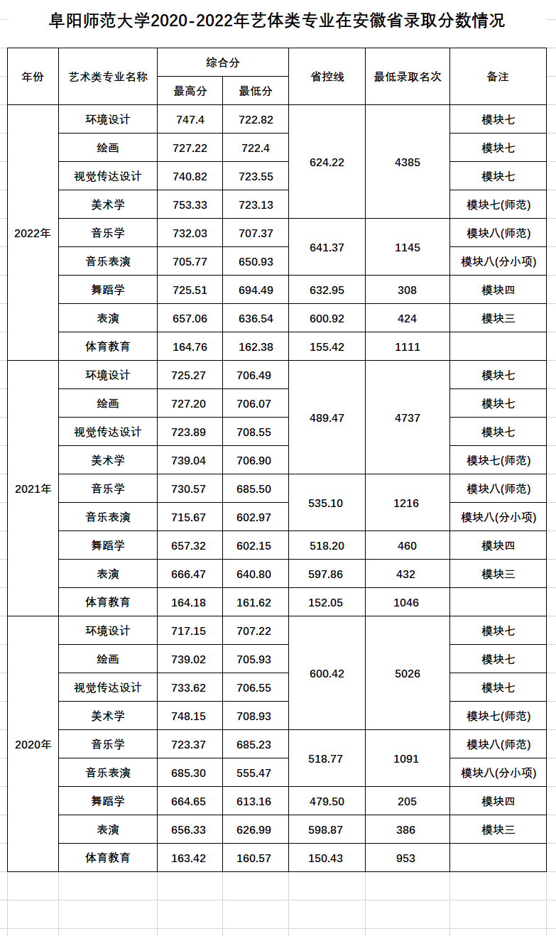 阜阳师范大学2020-2022年艺体类专业在安徽省录取分数情况