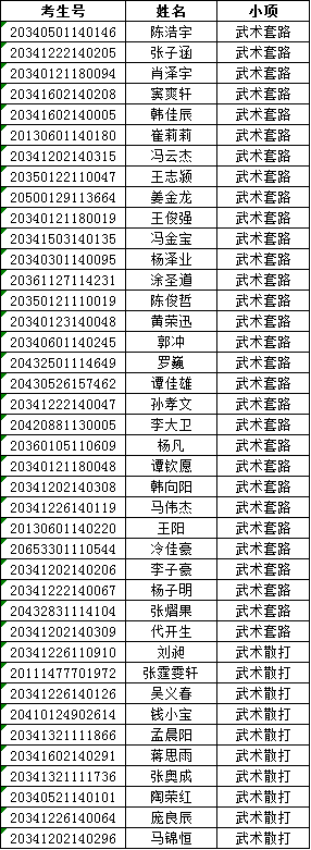 根据我校《阜阳师范大学2020年武术与民族传统体育专业招生简章》, 2020年民族传统体育专业拟录取以下40名考生,现予公示。