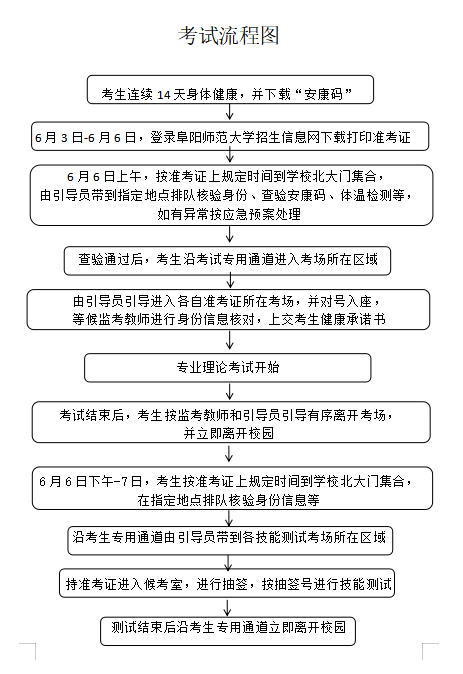 4.考试当天按照规定时间到学校北大门(阜阳市清河西路100号阜阳师范大学西湖校区)前指定区域排队进行身份核验、健康码查验、体温检测,检测合格后方能进入校园。进校后须沿考生通道径直前往考场所在区域,在引导员引导下按照准考证上的考场号及座位号进入考场,对号入座。不得在校园其他区域闲逛、聚集。