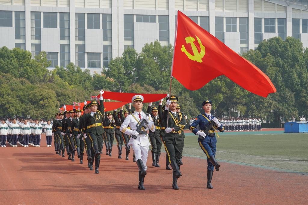 来自我校学生社团八一社和国旗护卫队的22名学生手持党旗、国旗、校旗、军训团团旗依次走过主席台。在他们的引领下,由2021级新生组成的61个分列式方阵,踏着激昂的旋律,精神抖擞,意气风发地依次走过主席台,把军训成果汇报推向高潮。