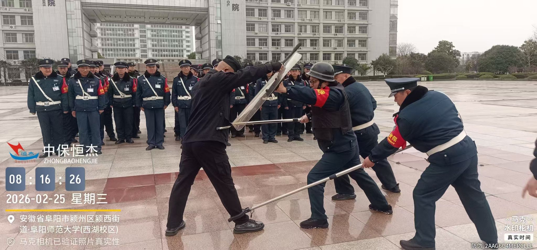 为切实做好2026年春季学期开学安全保障工作,进一步提升校园安保队伍的专业素养和应急处置能力,2月24日至25日,根据安全管理处工作部署,中保恒杰保安服务集团有限公司驻阜阳师范大学项目队精心组织,分别在西湖校区、清河校区有序开展了开学前安保工作部署会议及器材使用专项培训。两校区全体安保人员参加了此次活动。
