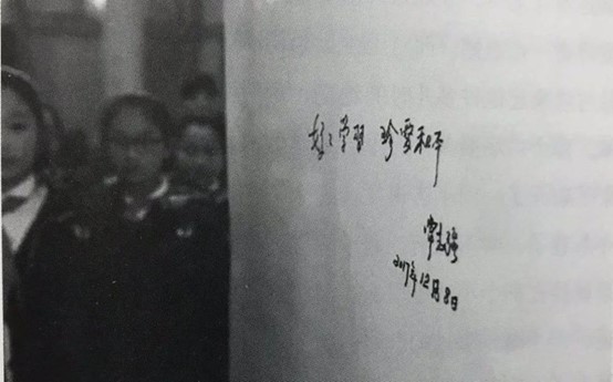 常志强给孩子们写下“好好学习,珍爱和平”的寄语