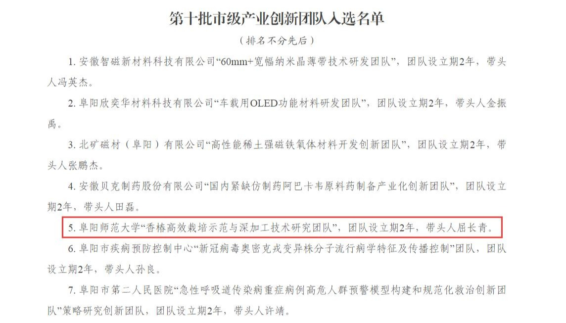 近日,阜阳市人才网公布了第十批市级产业创新团队入选名单,我校屈长青教授主持申报的“香椿高效栽培示范与深加工技术研究团队”入选。