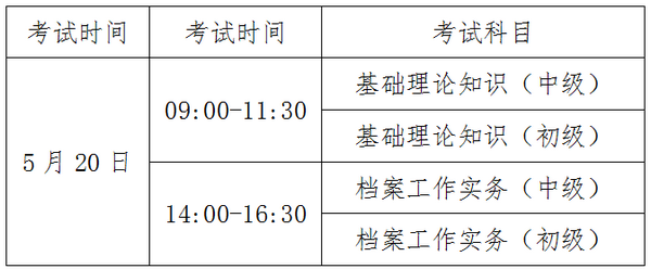 考试分为中级(档案馆员)、初级(档案管理员、档案助理馆员)两个级别。具体考试时间和考试科目如下: