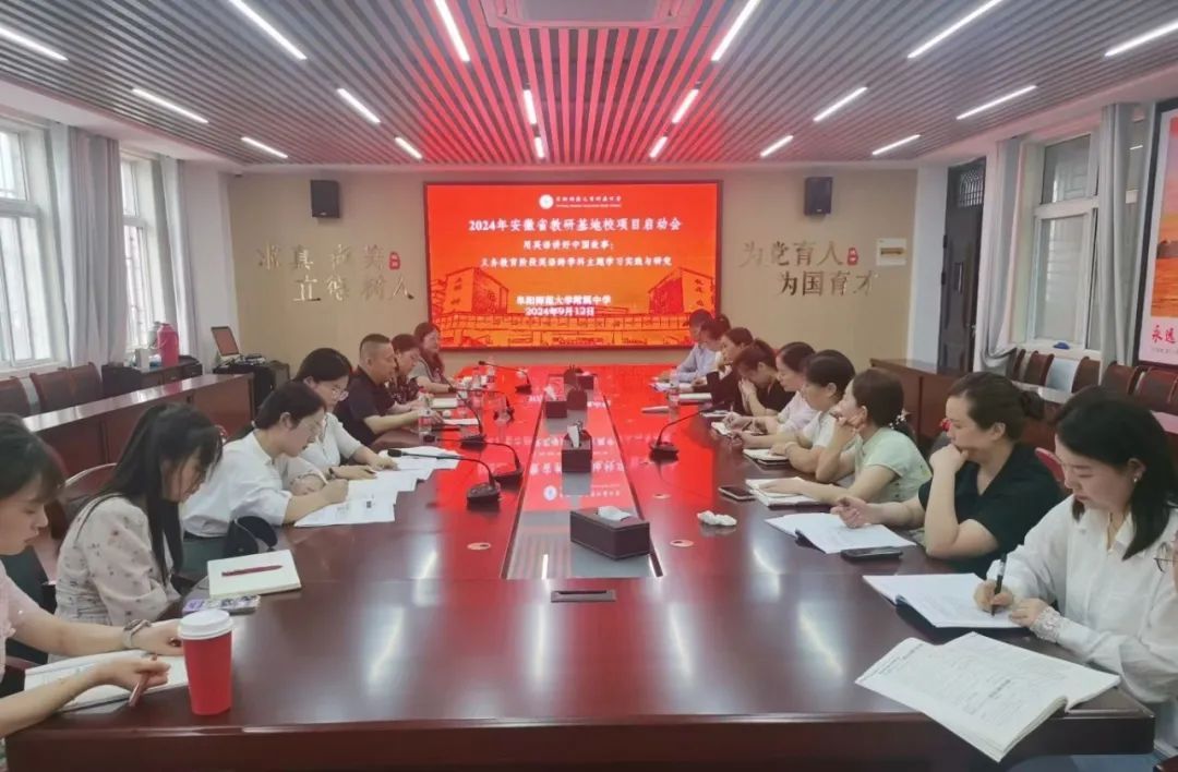 今年我校获批安徽省中小学幼儿园英语学科教研基地,为推动落实基地校建设,发挥基地校示范作用,9月12日下午,我校召开安徽省英语学科教研基地校项目“用英语讲好中国故事:义务教育阶段英语跨学科主题学习实践与研究”启动仪式。阜阳市教育局英语教研员郭永飞到会指导,教育集团副总经理、附中副校长方帅军和英语教研组全体教师参会,会议由教研组长程丽丽主持。