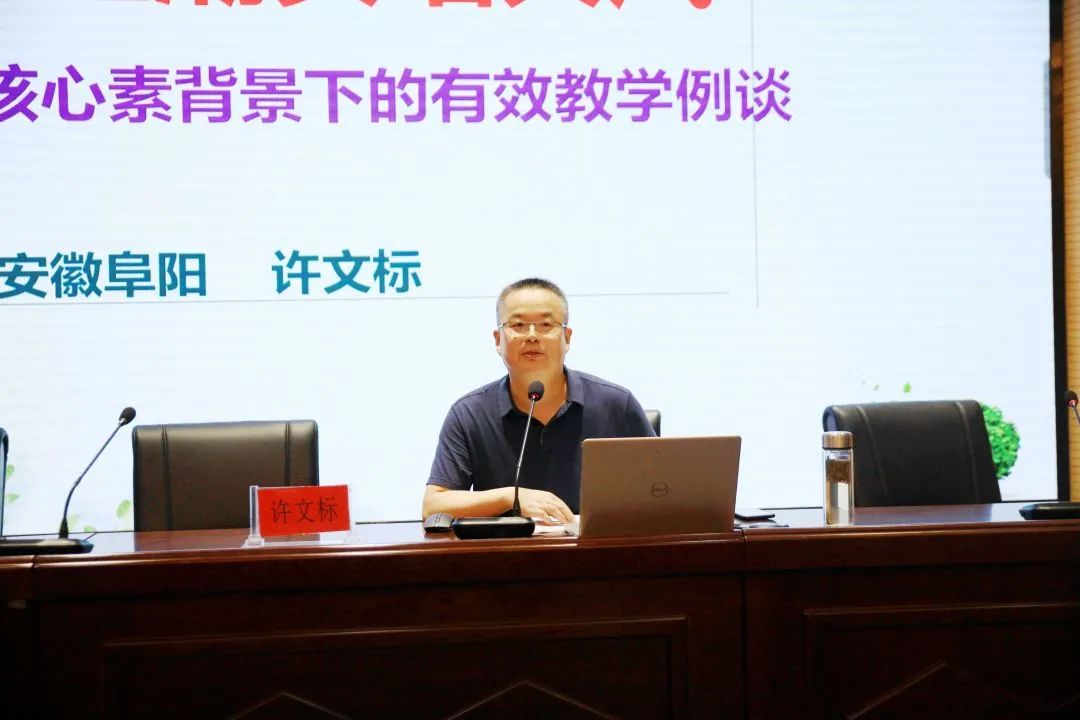 阜阳六中副校长许文标作专题报告《勇立潮头唱大风——核心背景下的有效教学例谈》。许文标首先以问题为导向,深入解读了新课程标准修订的背景,框架及创新处。他以语文教学为例,带领老师们探讨基于核心素养下的语文有效教学。并提出教师要学会教材的研读能力,整合能力和突破能力,鼓励全体教师用积极的心态去迎接新课标、新挑战,用有效的实践去丰富新理念,新教材。