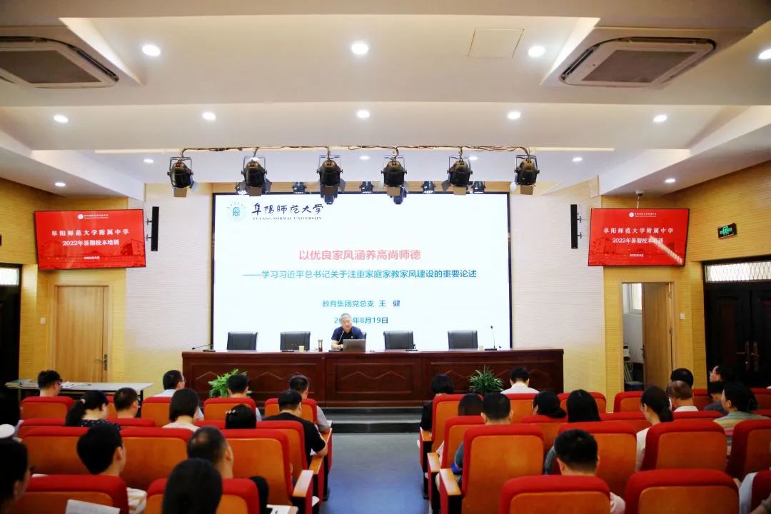 教育集团党总支书记王健在《以优良家风涵养高尚师德》的报告中,带领全体教师认真学习了习近平总书记关于注重家庭家教家风建设的重要论述,指出了教师在指导家庭教育中的职责和作用。同时告诫全体教师要慎独慎微,自我净化,修己达人;守住底线,不用公权为家庭谋私;抵制诱惑,淡泊名利,无欲则刚。希望全体教师有信念,懂自律,追求卓越,再创一流。
