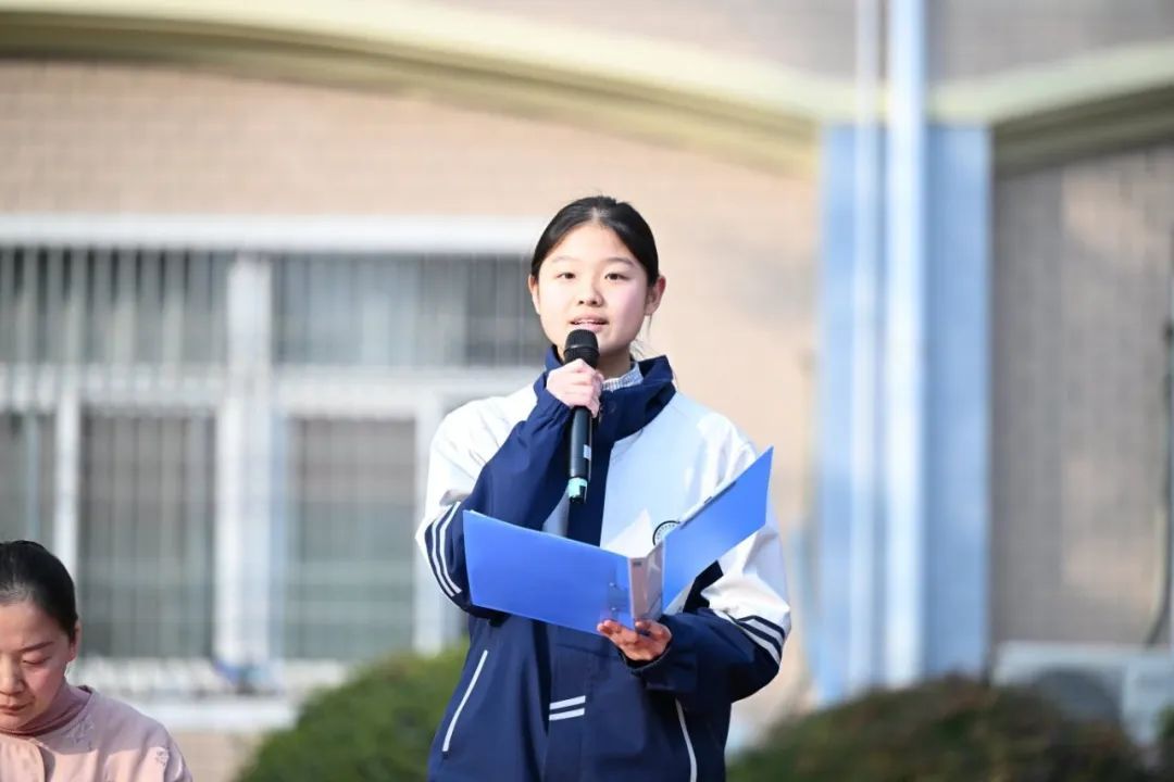 八(3)班庞若溪同学代表五好学生发言。她分享了自己的学习经验:内驱力+专注力+抗压力=好回报。