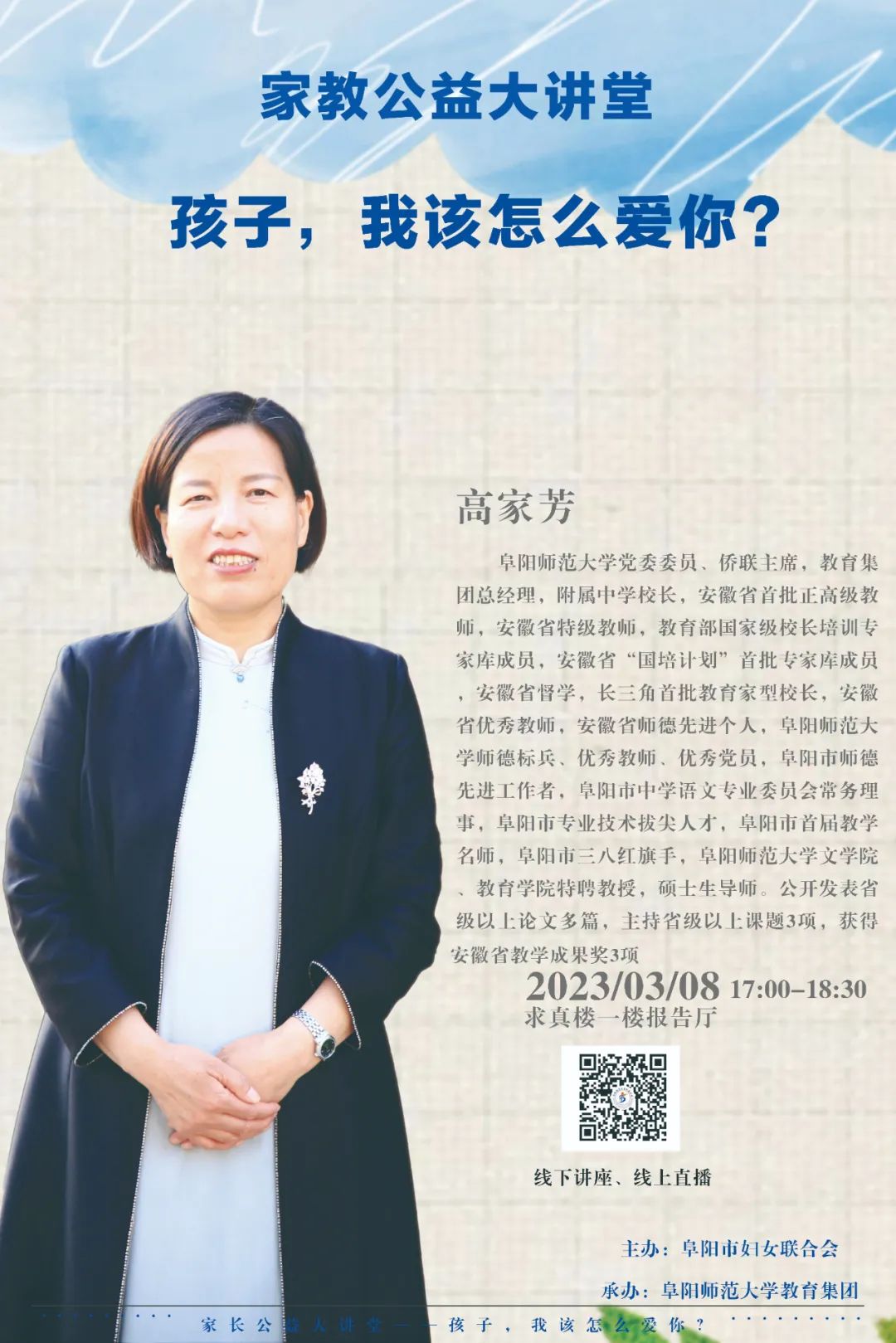 为贯彻落实2022年1月1日实施的《中华人民共和国家庭教育促进法》,引导广大家长尊重家庭教育规律,更新育儿观念,增进家校协同共育,助力孩子健康成长,由阜阳市妇女联合会主办,阜阳师范大学教育集团承办的家教公益讲堂将于2023年3月8日举行。