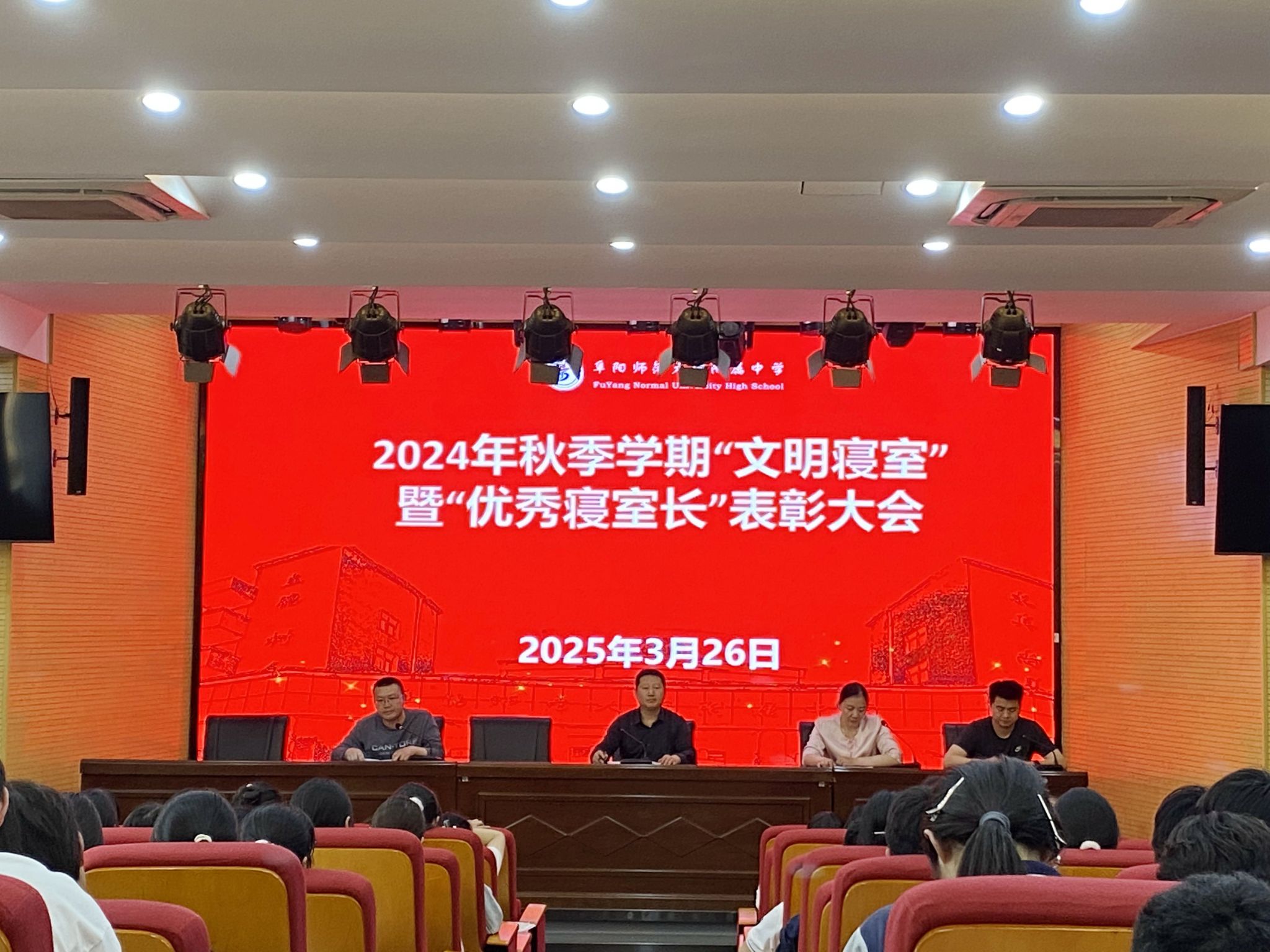 为营造文明和谐的宿舍环境,树立榜样力量,推动校园文化建设,阜阳师范大学附属中学于2025年3月26日下午隆重召开“2024年秋季学期“文明寝室”暨“优秀寝室长表彰大会”。校领导、师生代表齐聚一堂,共同见证优秀宿舍及优秀寝室长的荣誉时刻。