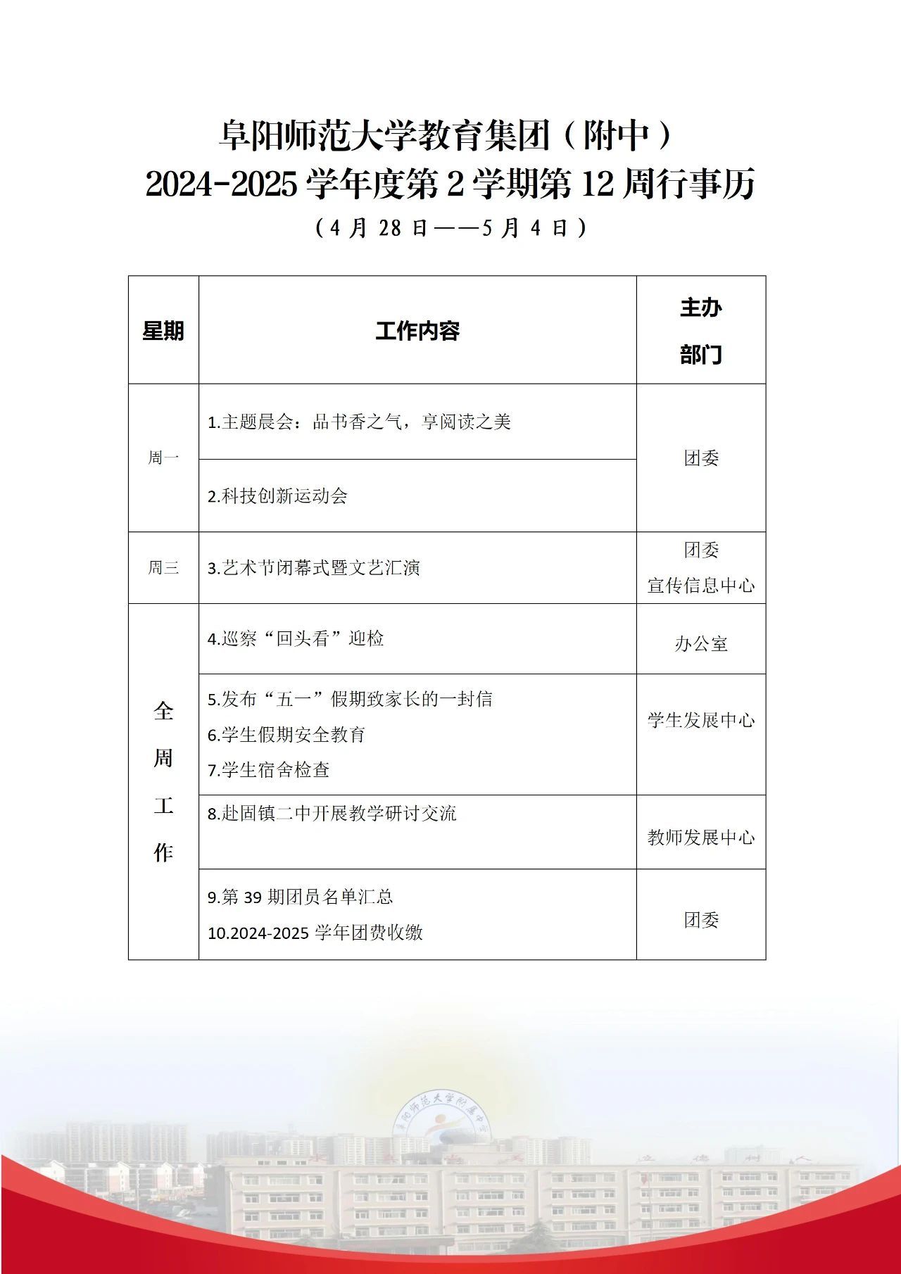上一条:阜阳师范大学教育集团(附中)2024-2025学年度第二学期第13周行事历