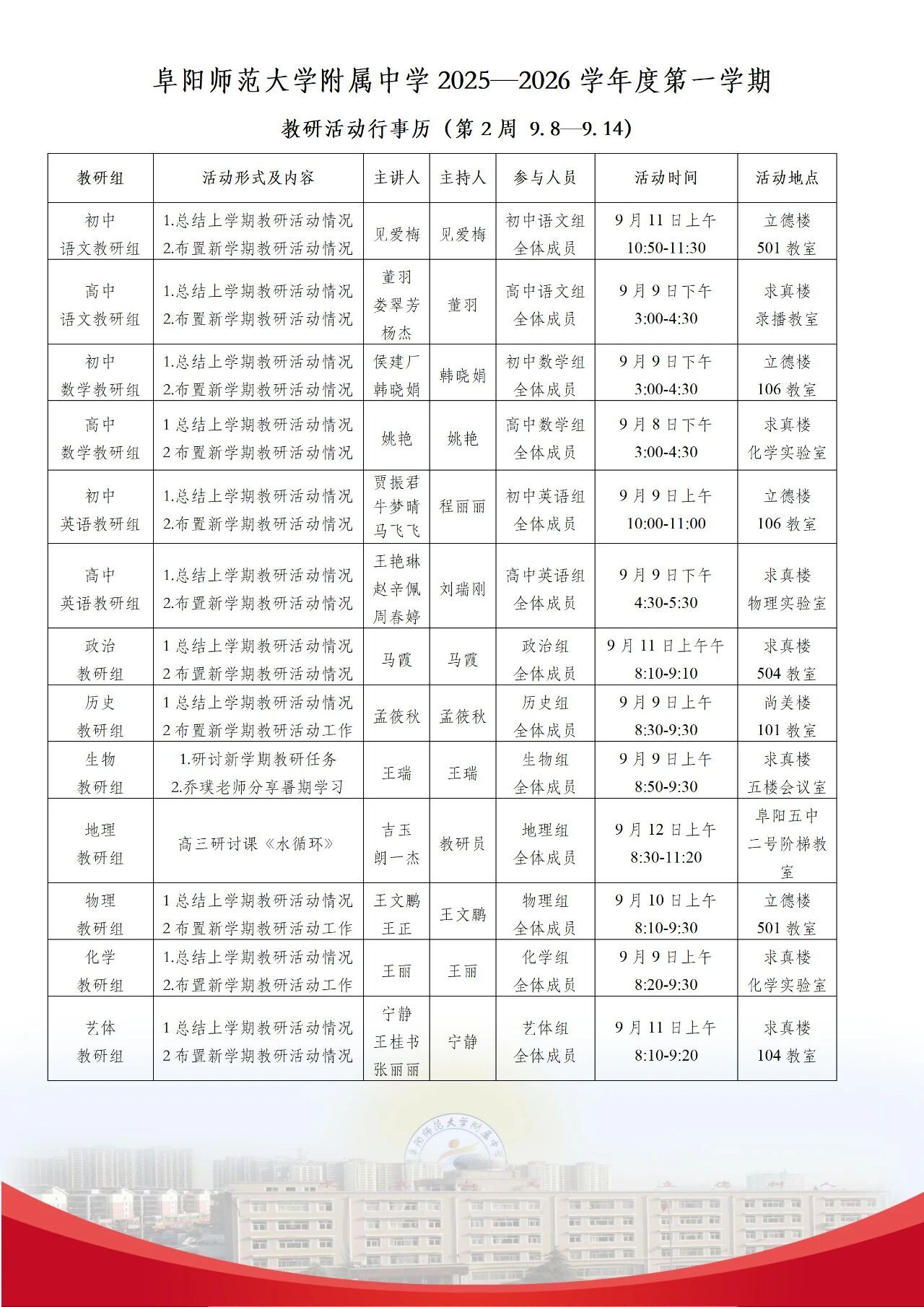 上一条:阜阳师范大学教育集团(附中)2025-2026学年度第1学期第3周行事历
