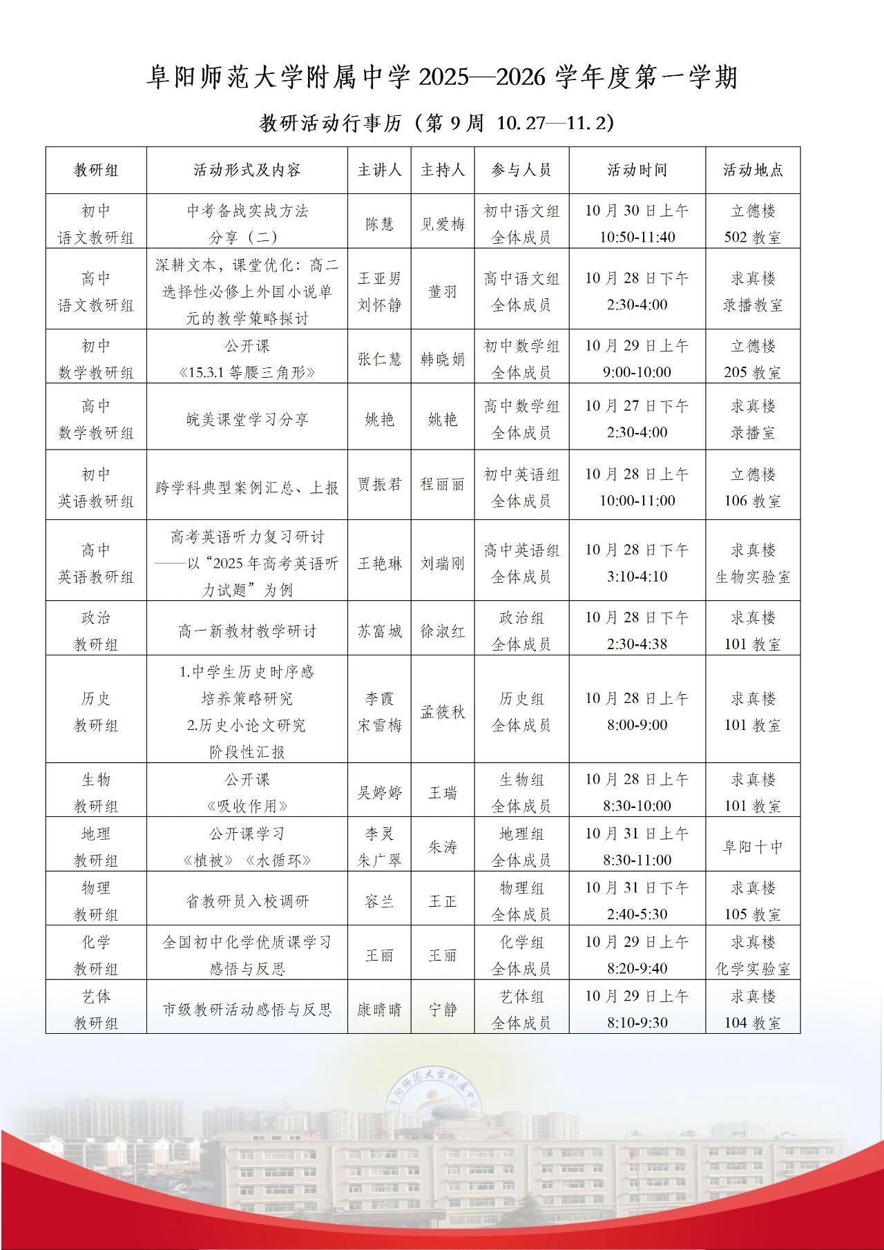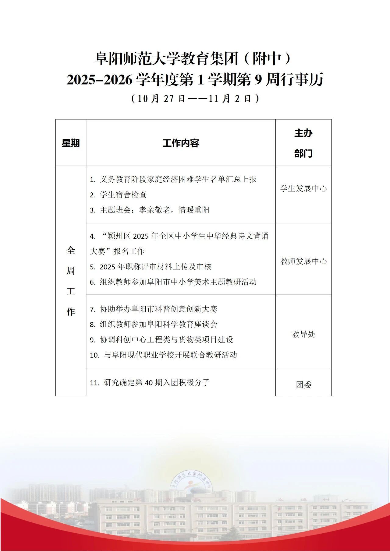 上一条:阜阳师范大学教育集团(附中)2025-2026学年度第1学期第10周行事历