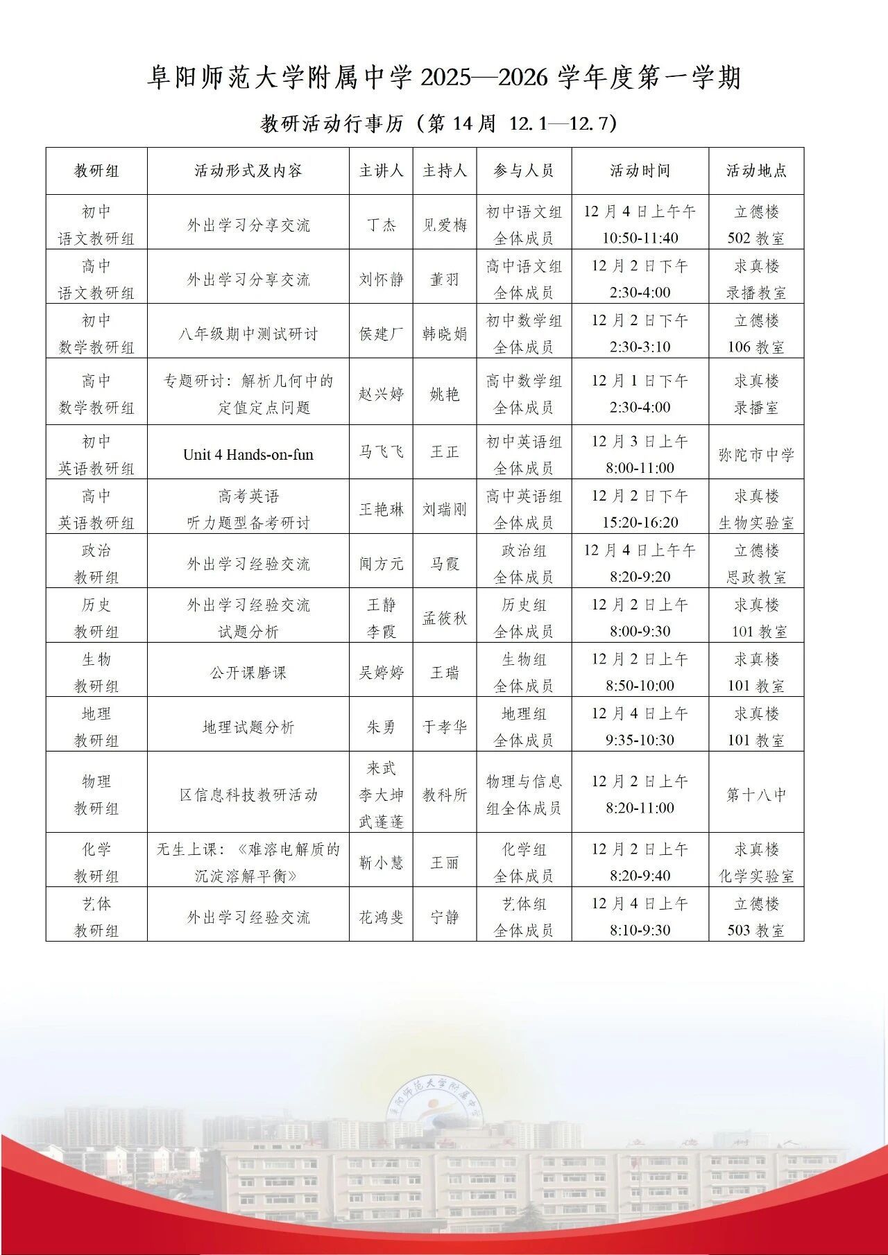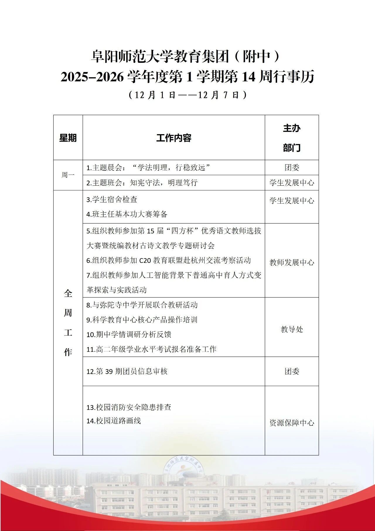 上一条:阜阳师范大学教育集团(附中)2025-2026学年度第1学期第15周行事历