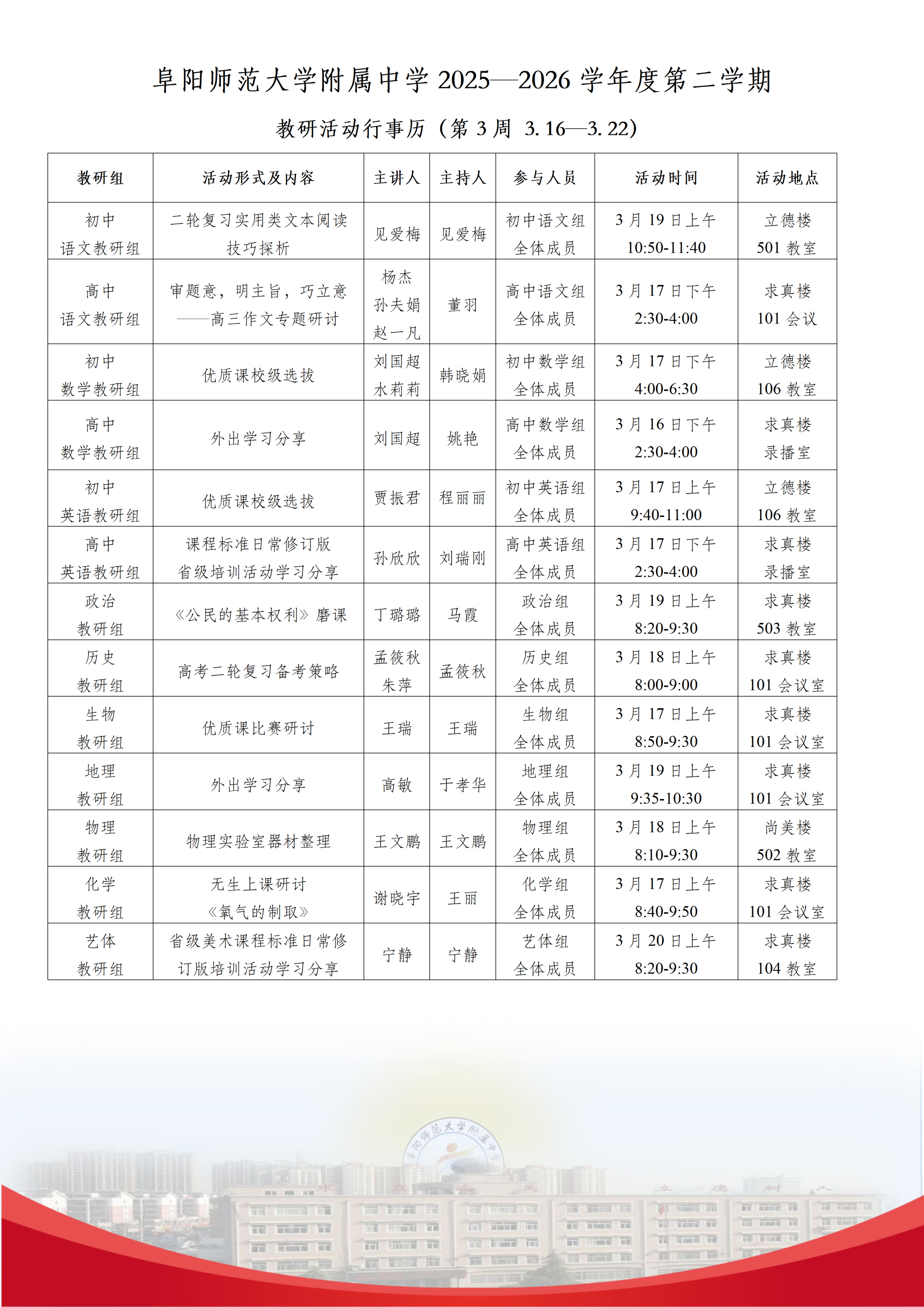 上一条:阜阳师范大学教育集团(附中)2025-2026学年度第2学期第4周行事历