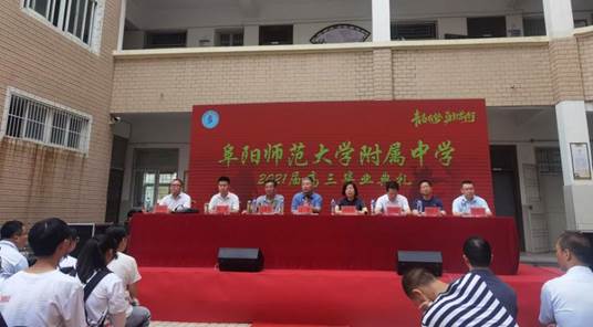 莅临本次典礼的领导有阜阳师范大学教育集团党总支书记王健,阜阳师范大学教育集团总经理、附中校长高家芳,阜阳师范大学教育集团副总经理、附中副校长吕新华,阜阳师范大学教育集团副总经理、附中副校长方帅军,阜阳师范大学教育集团党总支副书记徐升,教导处主任陈发兵,团委书记年明点,高三年级毕业班全体老师以及2021届全体毕业生。毕业典礼由高三年级主任见涛主持。