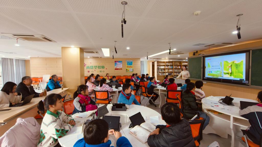 在合肥高新创新实验小学,考察组现场观摩了智慧课堂教学示范课,深入了解智慧课堂在小学的应用情况,在座谈会上,合肥高新创新实验小学校长许金芳介绍了学校智慧校园运行及应用情况,双方着重对智慧校园建设就小学阶段学生综合能力的提升及智慧课堂在延迟服务中的应用做了交流。