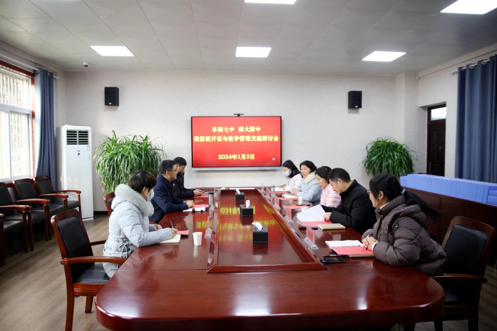 1月3日,阜阳七中校长曹南学一行三人来我校调研俄语特色课程建设和教学管理情况。教育集团总经理、附中校长高家芳,副总经理、附中副校长方帅军等参加会议。