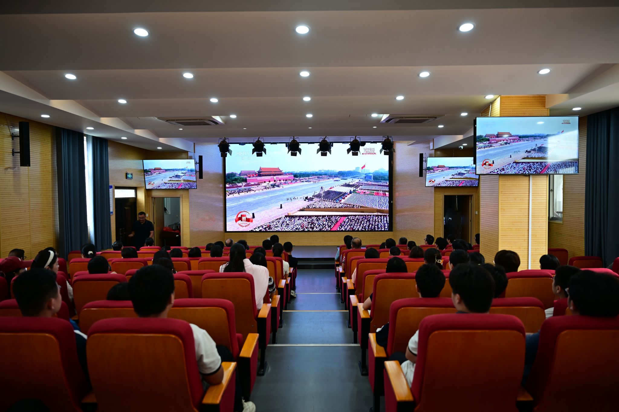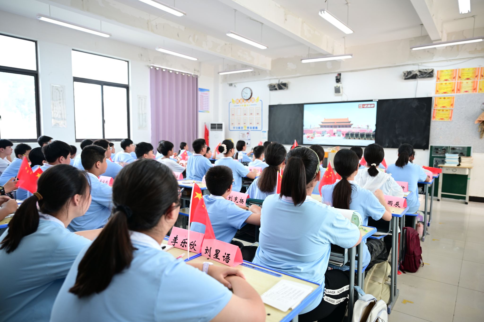 阅兵式开始后,学生们手持五星红旗,安静地坐在教室里,观看在北京天安门广场举行的纪念中国人民抗日战争暨世界反法西斯战争胜利80周年阅兵式直播。直播过程中,同学们被整齐的方阵、先进的装备以及盛大庄严的场面深深震撼,不时爆发出阵阵惊叹与掌声。