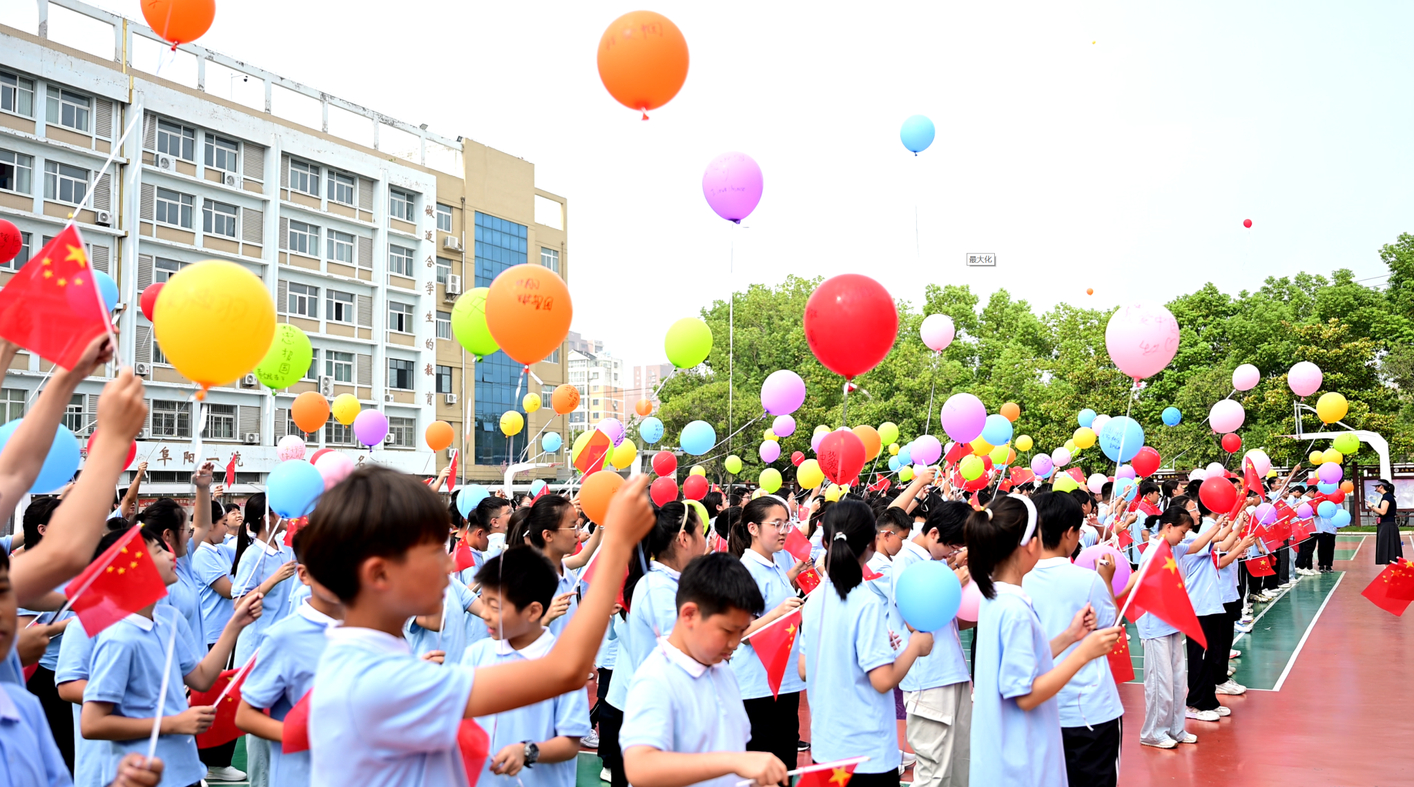 大课间时,七年级全体学生齐聚在求真楼操场,举行放飞祝福气球活动。同学们事先在气球上写下“铭记历史,珍爱和平”“弘扬抗战精神,共筑美好未来”等饱含深情与期望的祝福语。在主持人的引导下,五彩斑斓的气球缓缓升空,带着同学们对和平的憧憬与对未来的美好祝愿,飞向广阔的蓝天。