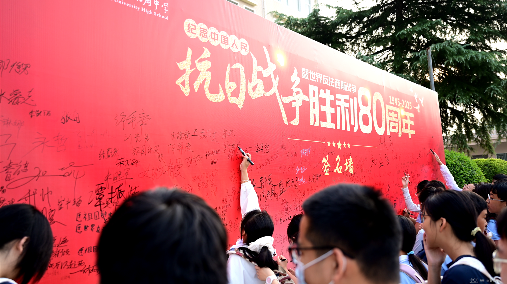 清晨,师生们踏入校园,大家有序排队,郑重地在墙上签下自己的名字,以此表达对先烈的缅怀及对和平的珍视。签名结束后,不少师生还在签名墙前合影留念,现场氛围庄严肃穆,又满含着对历史的敬畏及对和平的向往。