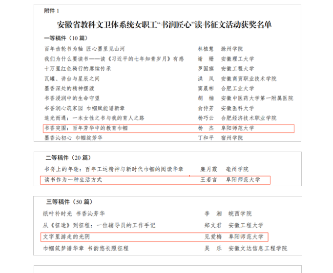 近日,在安徽省教科文卫系统“书润匠心”读书征文活动中,教育集团杨杰、见爱梅凭借深厚的阅读积淀与出色的文字表达,分获安徽省一等奖、三等奖,为阜阳师范大学及教育集团赢得了荣誉。