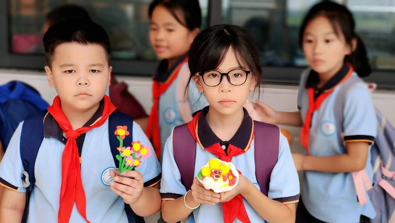 活动三:“做花束,绘心意”。三年级学生自己动手用彩纸制作花束,用粘土制作花篮,各式各样的节日礼品表达了孩子们节日祝愿和美好祝福。