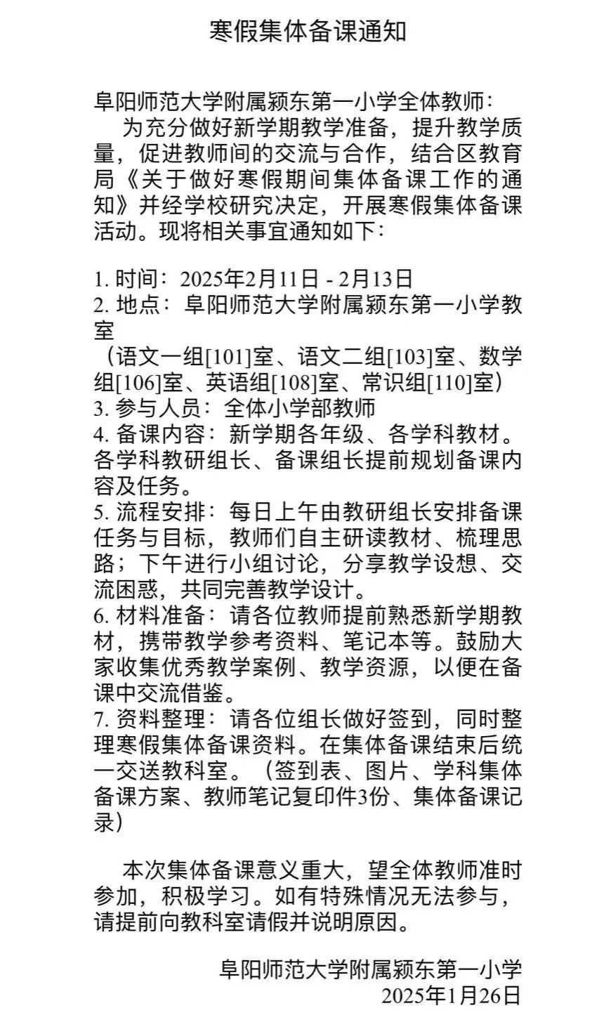为了提高教师的备课效果和教学水平,更好地凝聚集体智慧,助力高效课堂,确保新学期各项工作的有序开展。2月11日-2月13日,阜阳师范大学附属颍东第一小学组织全体教师以学科教研组、备课组为单位开展为期三天的备课活动。