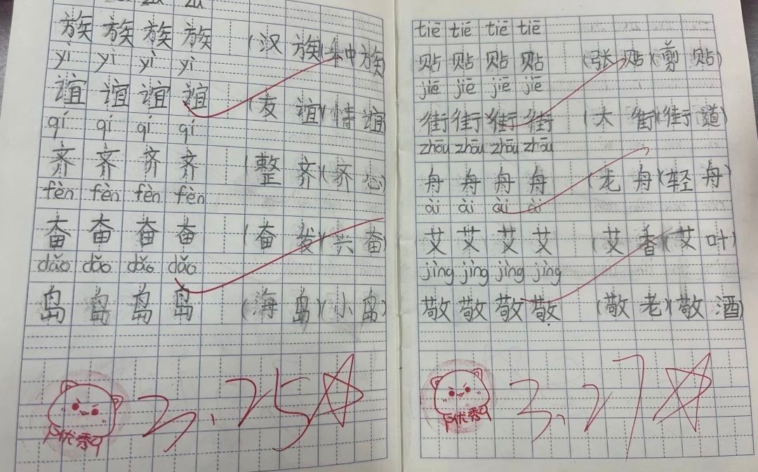 老师们创新批改方式,使用小印章、小贴画,同时附上关键词解析与温馨鼓励等形式激励学生,让学生在完成作业的过程中感受到乐趣和成就感。