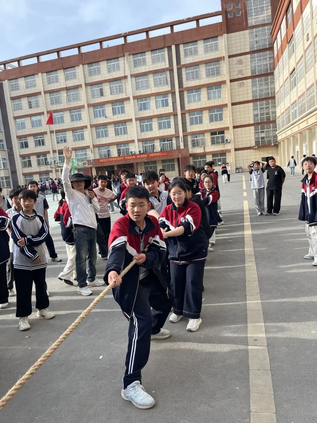 为深入践行"阳光体育运动"理念,培养学生团队协作精神,2025年5月7日下午,阜阳师范大学附属南京路中学在学校篮球场成功举办七年级“奔跑吧,青春!”主题拔河比赛。本次活动作为校园科技文化艺术节的重要组成部分,旨在通过集体运动增强学生体质,锤炼意志品质。