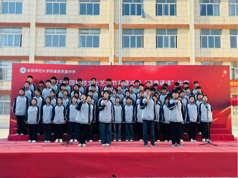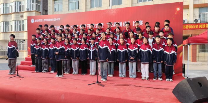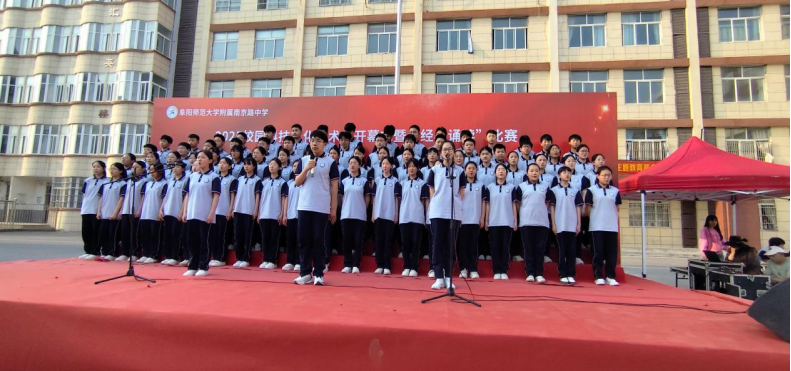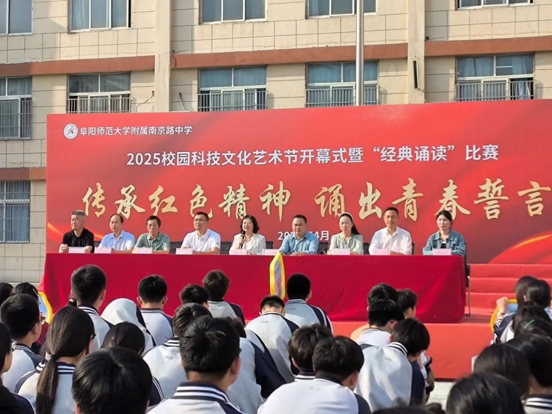 4月28日下午,附属南京路中学校园科技文化艺术节开幕式暨“传承红色精神 诵出青春誓言”经典诵读比赛隆重开启。比赛由刘永老师和刘晓晴老师主持,附属南京路中学校长贾振君、副校长王雷、副校长冉建峰、副校长孙欣欣、总务处主任王彬、教导处主任岳立志、政教处主任谢亚东及七八年级全体师生出席本次活动,共同感受经典文化的魅力。