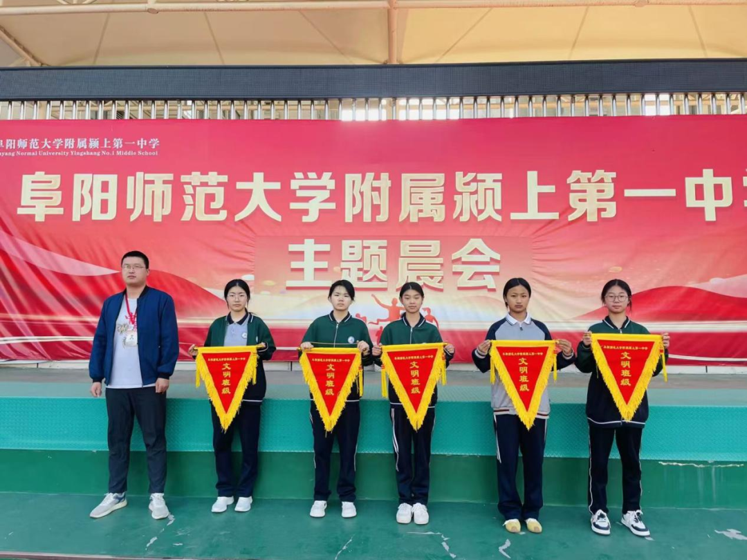 升旗仪式结束后,进入颁发文明班级环节。获得文明班级称号的是七(2)班,八(2)班,八(9)班,八(17)班,八(18)班。八年级副主任李后起为文明班级颁奖,鼓励他们继续保持良好的班风班貌,发挥榜样的力量,带动更多班级共同进步。