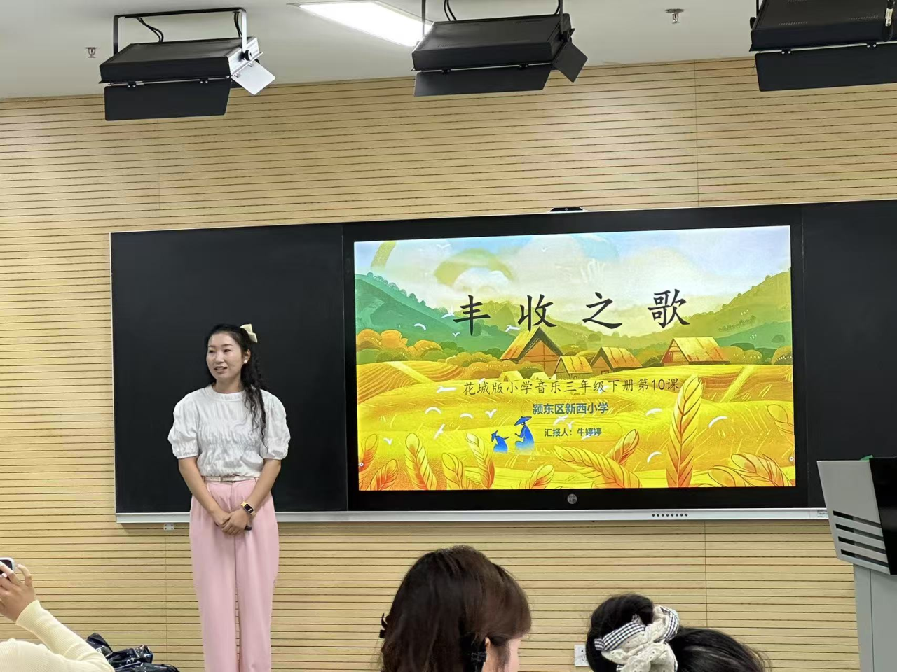 颍东区新西小学牛婷婷老师则以《丰收之歌》为载体,创新设计 “听赏-对话-评价” 三位一体教学链条。课堂中,她化身引导者,通过开放式问题激发学生主动思考,组织小组合作探究时鼓励学生互评互鉴,将教学、学习与评价环节无缝衔接。从旋律分析到节奏创编,从文化溯源到情感共鸣,每个环节都彰显出对核心素养的精准把握。