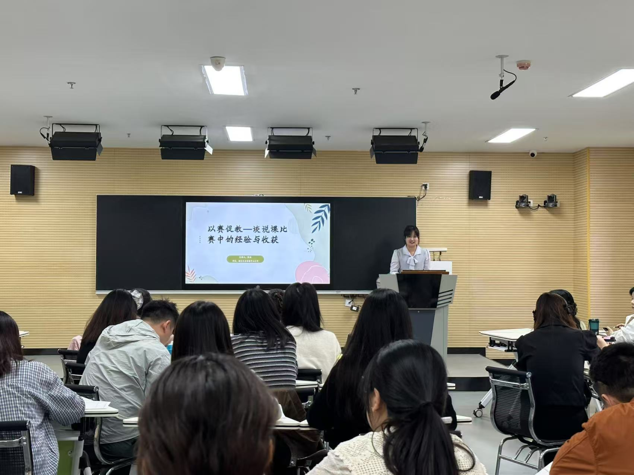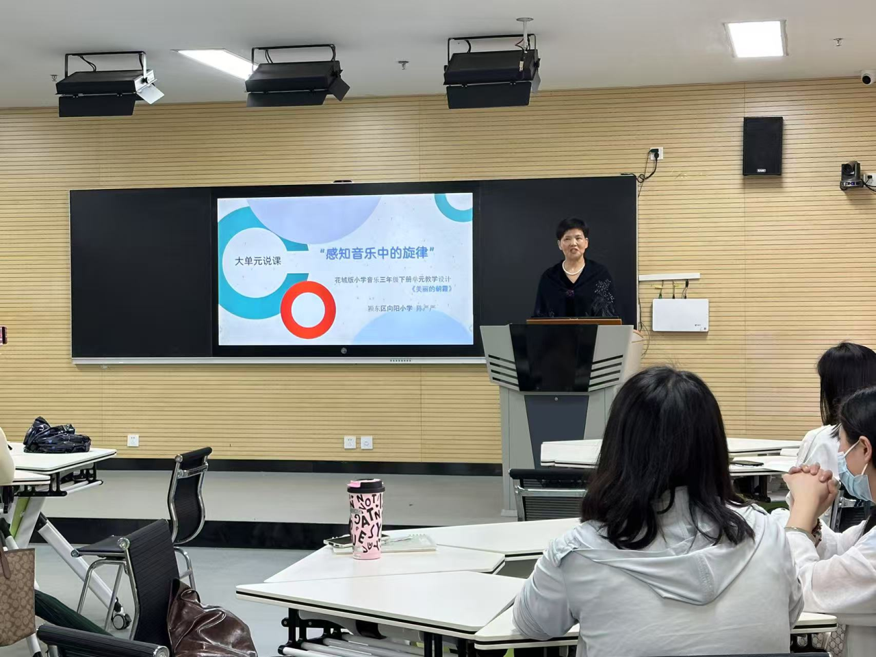 在说课环节,两场精彩纷呈的教学展示成为全场焦点。我校陈严严老师以《美丽的朝霞》为核心,通过精心剪辑的课堂实录,将前沿教学理念与创新技术深度融合。她巧妙运用 AI 智能伴奏、虚拟音乐场景构建等数字化手段,为学生搭建沉浸式学习空间——当屏幕中虚拟合唱团与现实课堂的童声交织共鸣时,传统教学模式被赋予全新活力,成功点燃学生的艺术热情。
