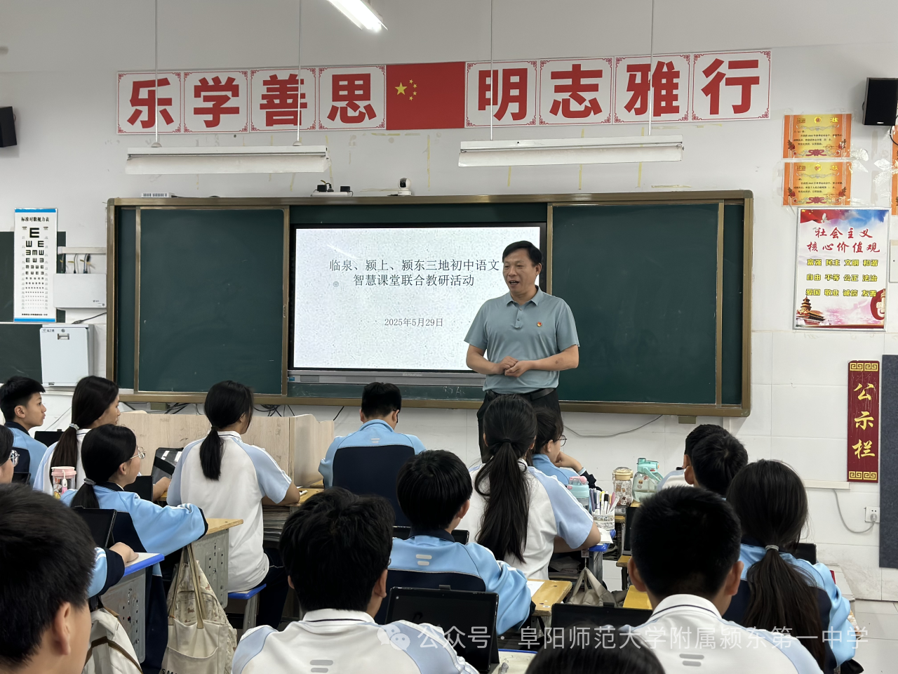 为深化智慧课堂与语文教学的融合创新,促进区域优质教育资源共享,5月29日,临泉县、颍上县、颍东区三地初中语文智慧课堂联合教研活动在阜阳师范大学附属颍东第一中学隆重举行。本次活动以 “智慧赋能课堂,文化浸润成长”为主题,通过精彩课例展示、前沿专题讲座、深度研讨交流三大环节,集中展现了三地教师在智慧教学领域的创新实践与深入思考。