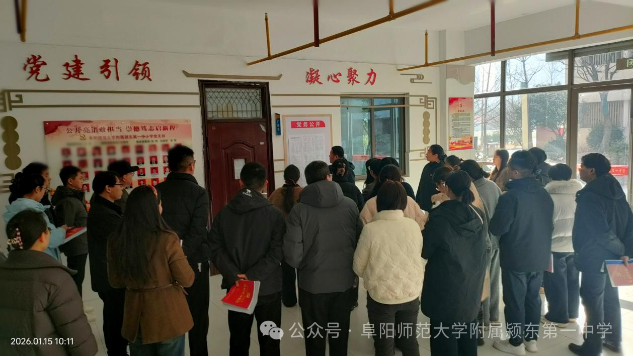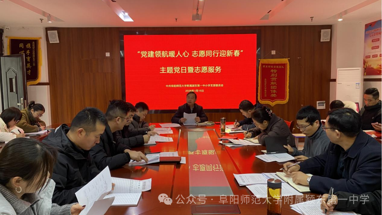 春潮涌动暖意浓,志愿同行迎新春。为深入贯彻落实上级党组织部署要求,充分发挥党支部战斗堡垒作用和党员的先锋模范作用,结合春节前夕工作实际,1月15日,阜阳师范大学附属颍东第一中小学党支部精心组织开展“党建领航暖人心 志愿同行迎新春”主题党日暨志愿服务活动。活动由党支部书记李向前主持,全体党员教师积极响应,入党积极分子、骨干教师主动参与,以“党建红”引领“志愿红”,在服务奉献中强化责任担当、厚植教育情怀,让融融春意浸润校园。