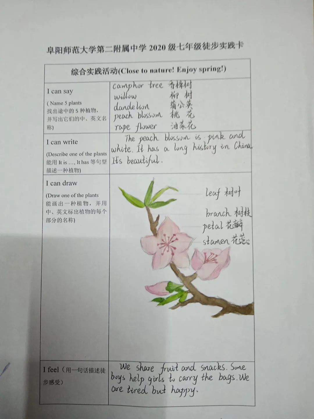 人间最美三月天,桃红柳绿山河间。介于仲春和暮春之间,正是一年中万物更新的时候。为进一步磨练学生意志,增强学生体魄,培养学生吃苦耐劳的精神。4月2日下午,阜阳师范大学第二附属中学2020级七年级开展了“走出课堂,亲近自然”徒步游学活动。