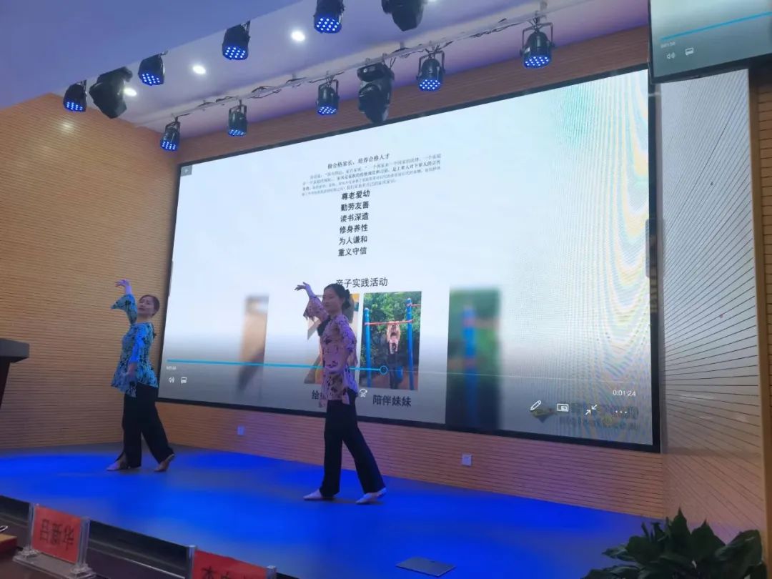 来自八年级(2)班的任皖豫讲述了她们家友爱和谐的种种生活场景,表达了对父母的感谢和感恩。并和妈妈一起为大家展示了自编的舞蹈《家风》。