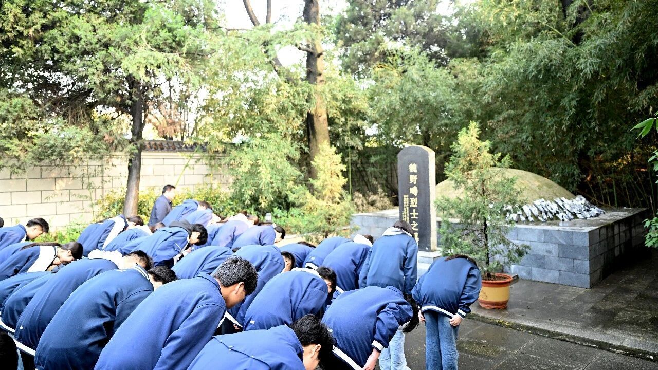 学生们在魏野畴烈士雕像前庄严集合,向烈士敬献花篮,学生代表小心翼翼整理花篮缎带,表达对革命先烈的深切缅怀;带队老师韩金理带领同学们深情追忆魏野畴革命烈士的英勇事迹,阐明本次参观研学的意义,希望同学们从先烈身上汲取精神力量,铭记历史、珍惜当下、勇担未来。学生代表李彧闻表达对革命先烈的崇敬之情,并代表全体同学郑重承诺:将传承先烈精神,努力学习、立志成才,用实际行动报效祖国。学生代表孙睿带领全体同学宣誓,展现新时代青少年传承红色基因、争做时代新人的坚定决心。