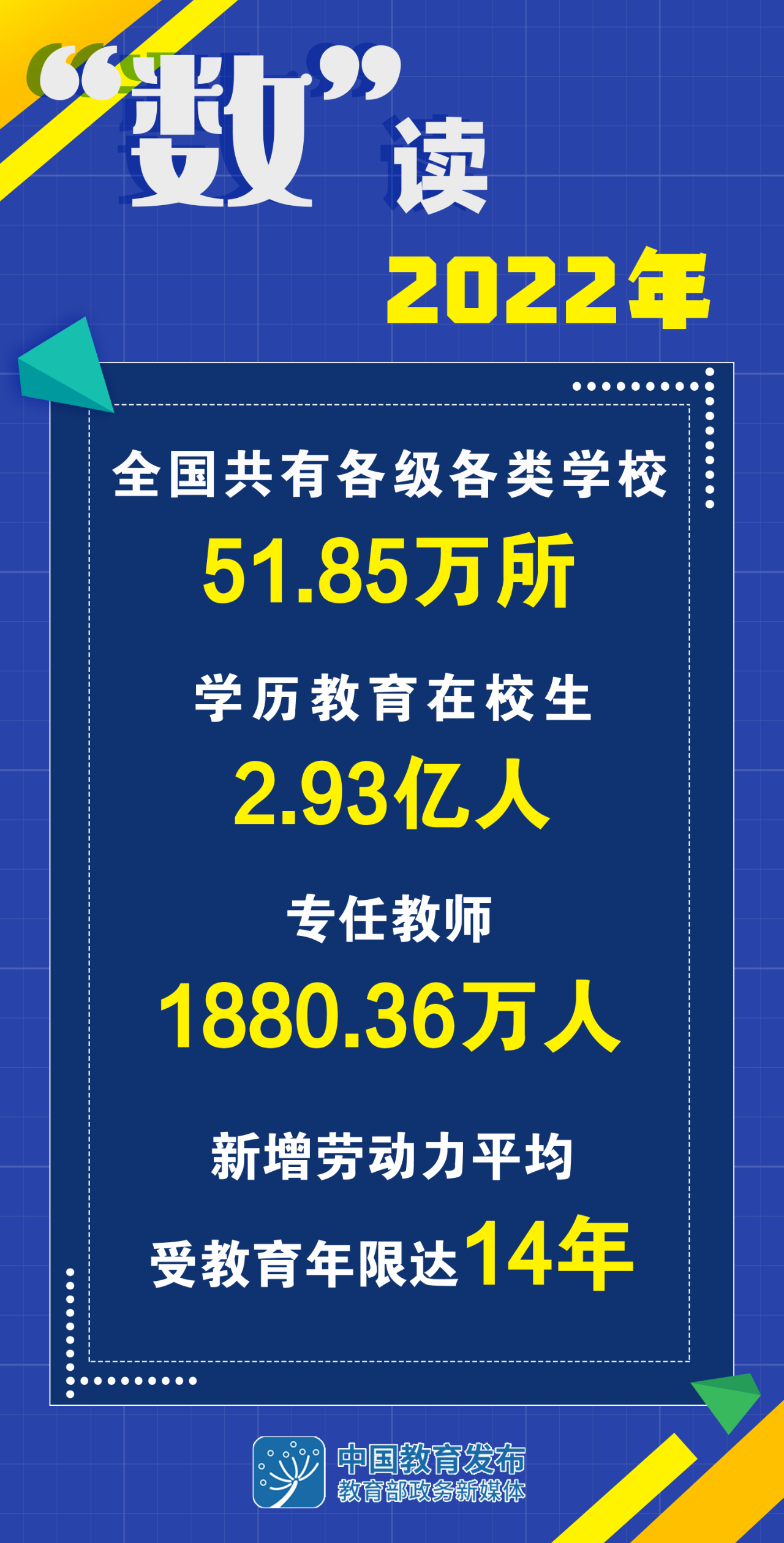 2022年全国共有各级各类学校51.85万所;学历教育在校生2.93亿人;专任教师1880.36万人。新增劳动力平均受教育年限达14年。分层级看,各级各类教育均取得显著进展。