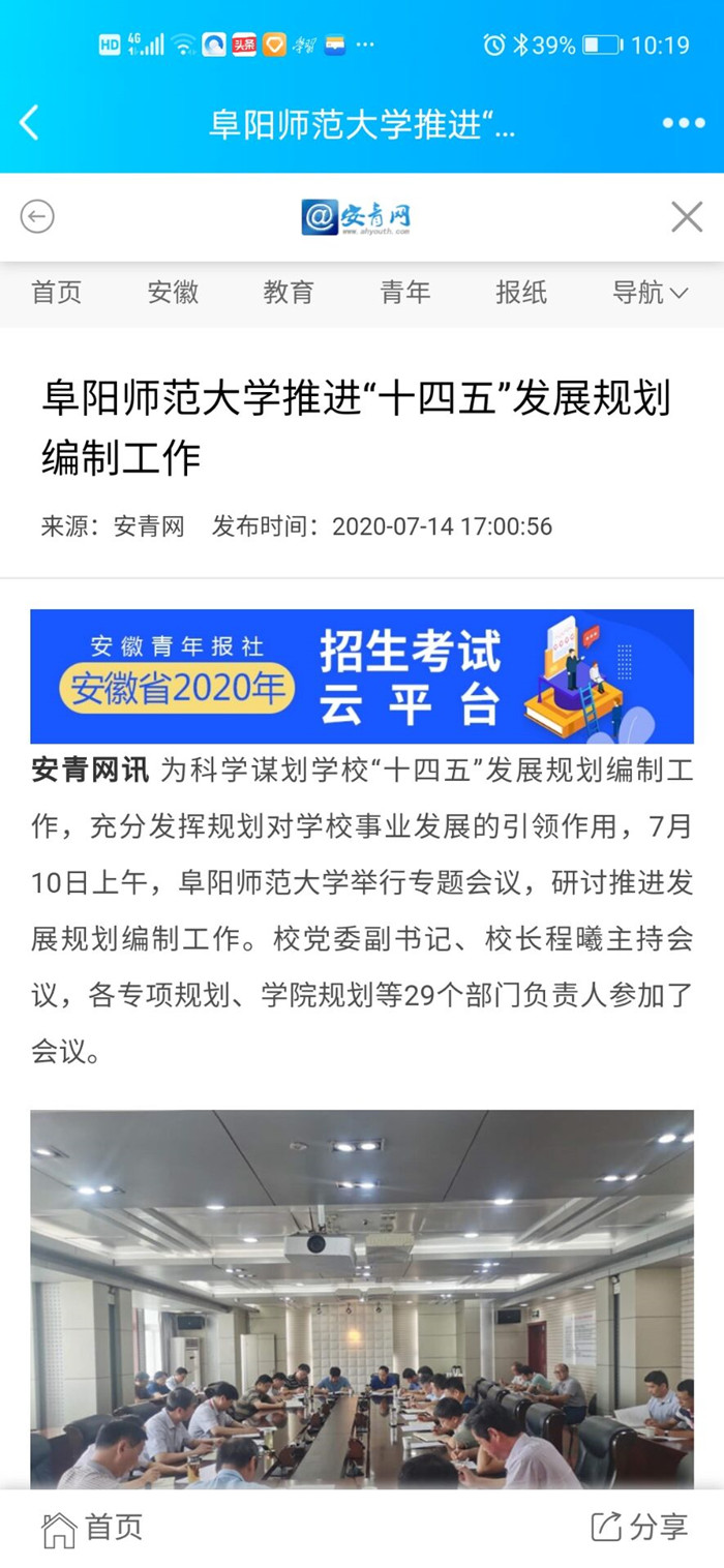 【新闻中心讯】 7月14日,安青网报道:阜阳师范大学推进“十四五”发展规划编制工作。文章地址:http://www.ahyouth.com/news/20200714/1469455.shtml
