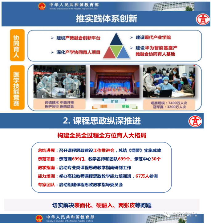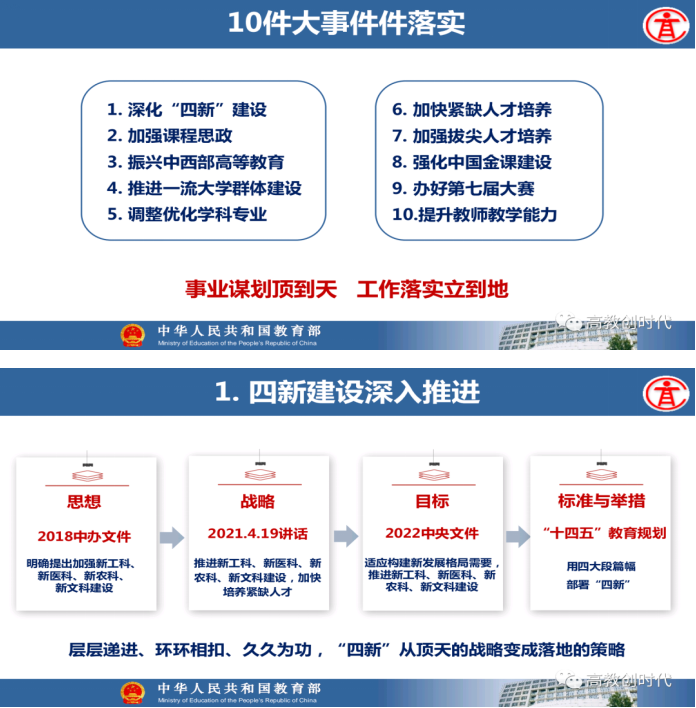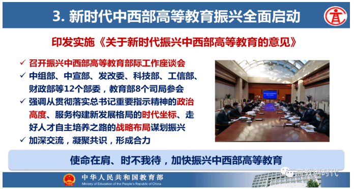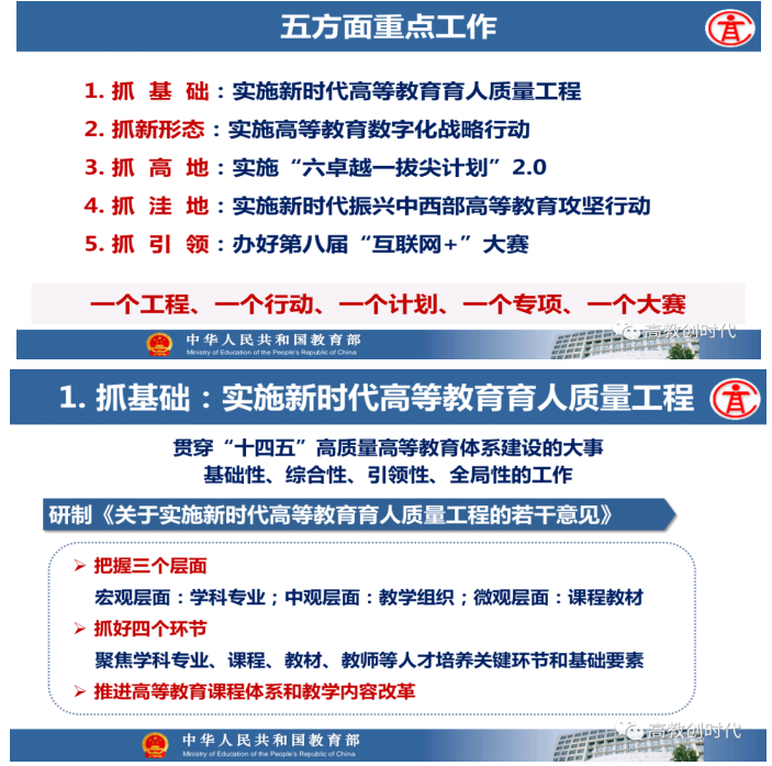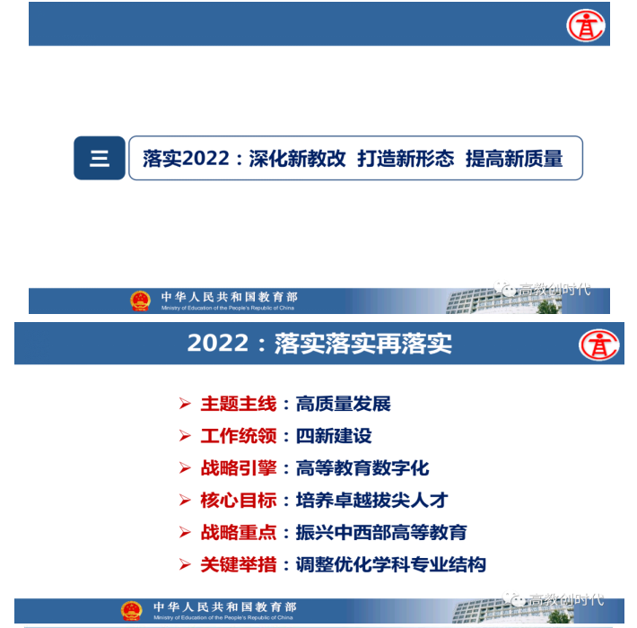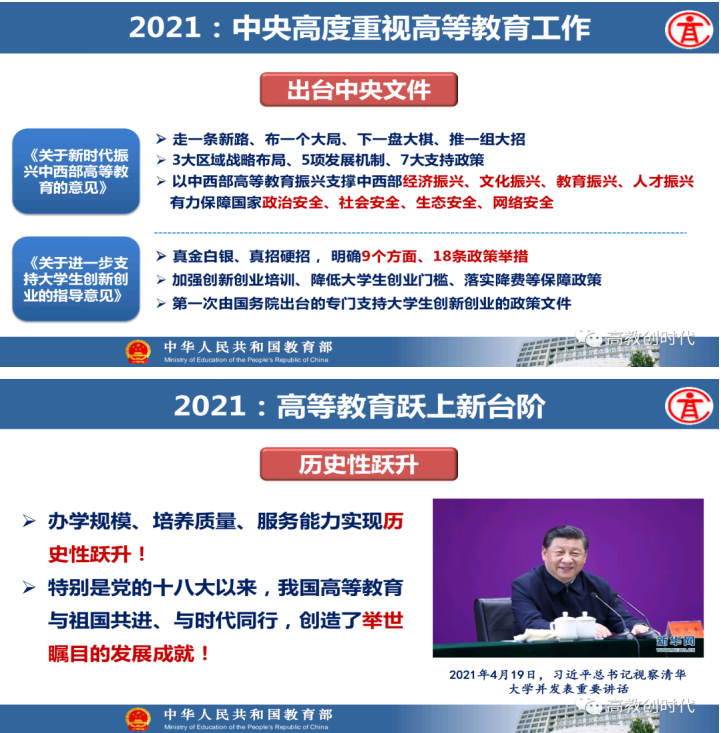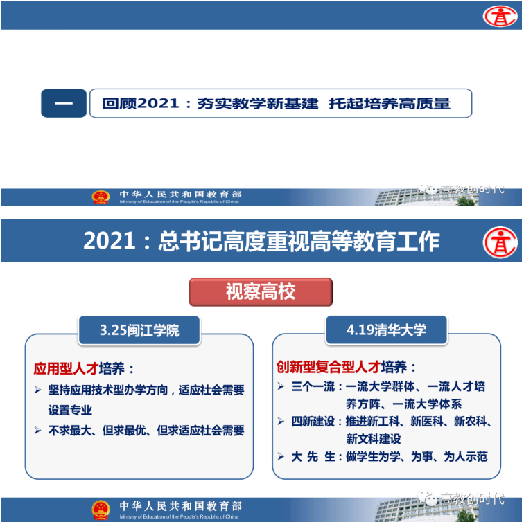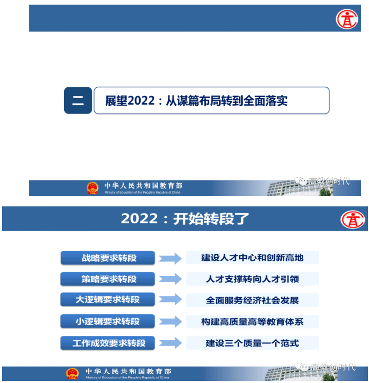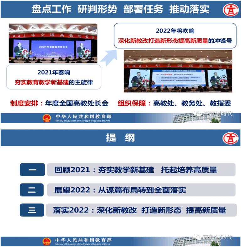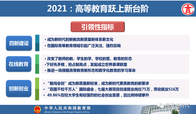 教育部高等教育司司长吴岩作主题报告,盘点总结2021年的工作,强调2022年要转段:要从战略上、策略上、大逻辑、小逻辑、工作成效上全面转段。要抓基础、抓新形态、抓高地、抓洼地、抓引领,从实施新时代高等教育育人质量工程、卓越拔尖人才培养、高等教育数字化、中西部高等教育振兴、“互联网+”大赛等五方面的战略任务,抓好20件大事的落实,让中国高等教育质量更高、实力更强、品牌更亮!