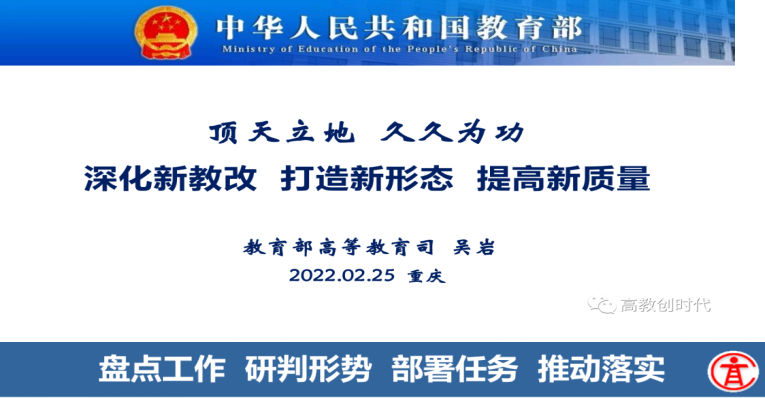 2月25日,2022年全国高教处长会在重庆市召开,旨在研究部署2022 年度推进高等教育高质量发展重点工作,全面提升高等教育根本质量、整体质量、服务质量,加快完善高等教育发展中国范式,走好人才自主培养之路。会议由教育部高等教育司副司长范海林主持,副司长王启明、武世兴出席会议。