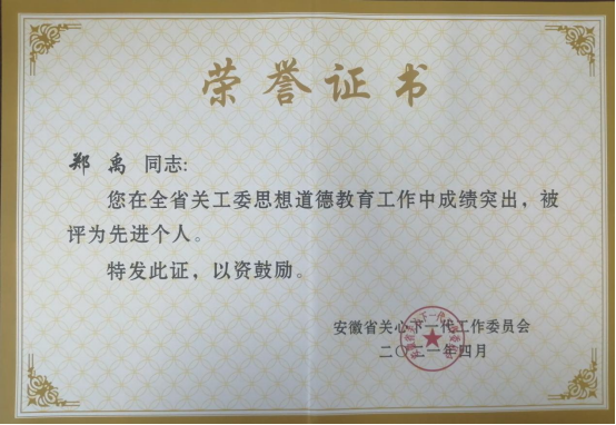 2021年4月,郑禹同志在全省关工委思想道德教育工作中成绩突出,被安徽省关心下一代工作委员会评为先进个人。