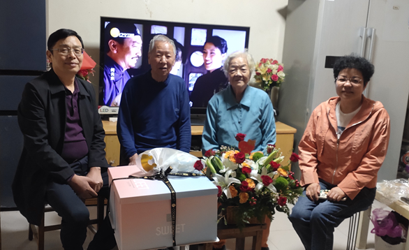 重阳节在即,离退休工作处代表学校上门为离休干部刘殿贝老同志庆祝九十大寿。离退休工作处处长付学楚为寿星送上鲜花和蛋糕。同时送去学校的关怀与温暖,转达了学校对他的问候与祝福,感谢他为党和国家以及学校的建设和发展所作出的贡献。