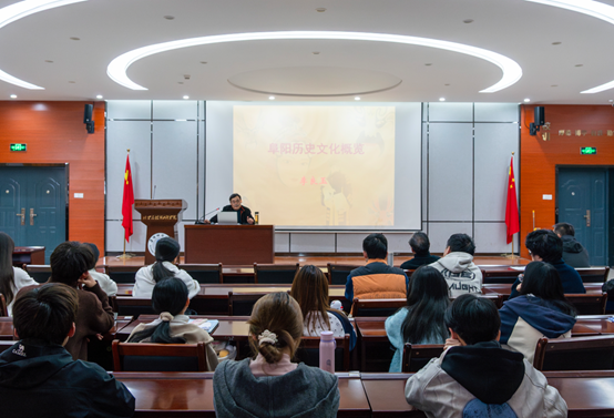 李良玉以“阜阳历史文化概览”为主题,围绕历史变迁、地名由来及文化传承三个维度,系统阐释了阜阳深厚的文化底蕴。在历史变迁部分,他依托详实史料,梳理了阜阳自先秦时期作为文明重镇,逐步发展成为淮河流域文化枢纽的演进历程,生动勾勒出不同历史阶段阜阳在政治、经济与文化领域的发展脉络与时代特征。关于地名由来,他深入解析了“阜阳”及其境内重要地名的历史渊源与文化内涵,深化了师生对阜阳地域文化的理解。在文化传承方面,他聚焦非物质文化遗产、传统民俗及红色文化等核心资源,系统阐述了地方文化在当代的传承价值与实践路径。李良玉鼓励青年学生主动成为阜阳文化的“传承者”与“传播者”,在学习生活中挖掘文化亮点、讲好阜阳故事。